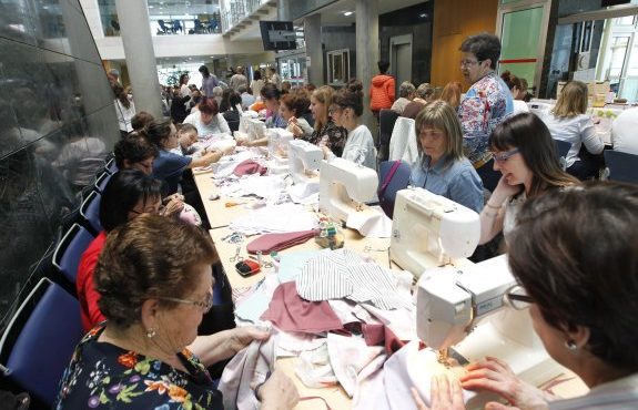 Tela, aguja, hilo, montones de miraguano para el relleno y toneladas de entrega e ilusión. Fueron los materiales que se emplearon ayer en el centro municipal integrado de Pumarín-Gijón Sur para confeccionar 725 cojines con forma de corazón que se repartirán por seis hospitales asturianos.